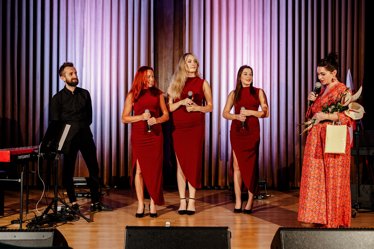 Gdy na scenie pojawiły się panie: Alicja Ploch-Burda, Joanna Skowyra i Paulina Świerczek – również absolwentka I Liceum Ogólnokształcącego im. Jana Kasprowicza – aula rozbłysła feerią barw, zarówno muzycznych, jaki i wizualnych. Wysoki poziom wykonywanych utworów, przy wspaniałym akompaniamencie Adama Jarzmika, sprawił, że licznie zebrana publiczność co rusz nagradzała wykonania wielkimi brawami.