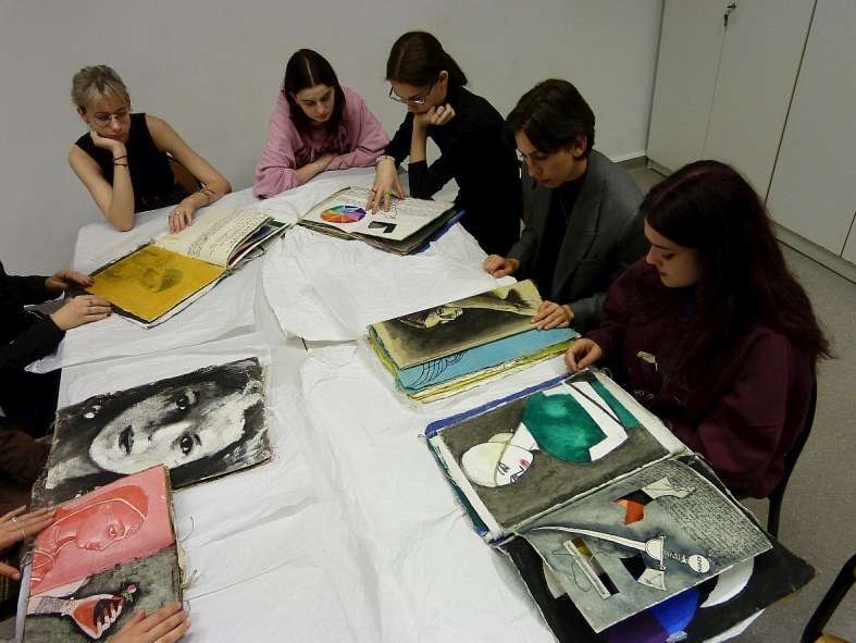 Pierwszym punktem programu było spotkanie w Muzeum Narodowym poświęcone księgom artystycznym Zbigniewa Makowskiego, wybitnego twórcy polskiej sztuki XX wieku. Pani Magdalena Szafkowska, pracownik działu grafiki współczesnej MN, przybliżyła osobę i twórczość tego malarza, rysownika, erudyty. Księgi artystyczne to ważny obszar działalności artystycznej Zbigniewa Makowskiego. Były one rodzajem notatnika, w których strumień świadomości malarza nabierał artystycznego kształtu. Wśród częstych motywów pojawiających się w tych księgach pojawiają się różnego rodzaju zapożyczenia, cytaty z dzieł wielkich mistrzów sztuki dawnej (np. Albrechtra Durera, Giorgiona, Jeana Ingres’a), ale również symbole zaczerpnięte z kultur i religii pozaeuropejskich, szczególnie wschodnich. Dbałość o dobór materiałów i stronę wizualną sprawia, że te ręcznie szyte przez samego Makowskiego księgi są na najwyższym poziomie artystycznym. W tych księgach obraz i tekst tworzą jedność, wzajemnie się przenikają i dopełniają. Pojawia się tam wiele odniesień do wybitnych dzieł literatury, filozofów oraz spisanych przez artystę własnych przeżyć i analiz, a wszystko zapisane w różnych językach, którymi biegle posługiwał się Makowski. Wielowątkowość i wielowymiarowość tych dzieł sprawia, że każda z ksiąg to ciekawa podróż i próba zagłębienia się w świadomość oraz podświadomość artysty. Podczas lekcji mieliśmy okazję przeglądnąć księgi, co jest wielką rzadkością, bo podczas wszystkich ekspozycji są prezentowane w szczelnie zamkniętych gablotach. Pani Szafkowska barwnie opowiadała o artyście, jego osobowości, gdyż miała okazję z nim się przyjaźnić. Temat ksiąg artystycznych nie przypadkowo pojawił się w klasie IV LSP, gdyż uczniowie sami będą realizować podobne zagadnienie w ramach lekcji rysunku i malarstwa.