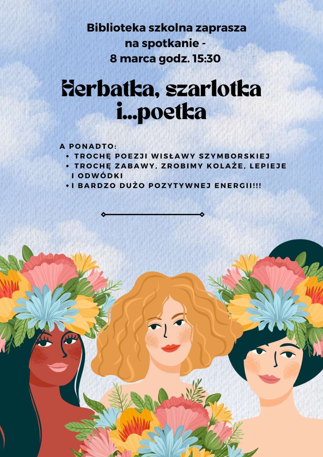 Biblioteka szkolna zaprasza na popołudniowe spotkanie z poezją Wisławy Szymborskiej, szarlotkę i herbatkę.