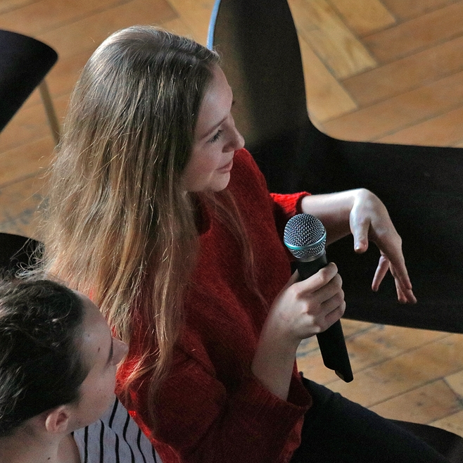 Spotkanie prowadziła Joanna Brzenczka, również uczennica klasy 1 J. Z niebywałą wnikliwością zadawała pytania, które nigdy jednak nie zaskakiwały samej autorki. Ta młoda pisarka udzieliła uczniom naszej szkoły kilku cennych wskazówek. Jednocześnie wydaje się niesamowicie związana ze swoją książką – pierwszym dzieckiem.