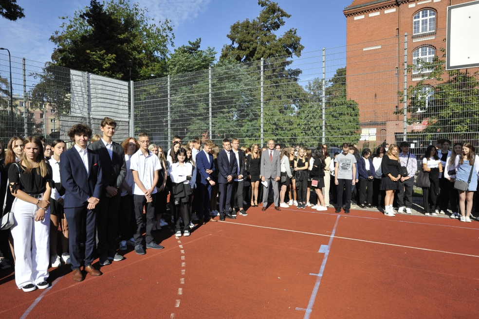 Pani dyrektor Marzena Kacprowicz szczególnie powitała uczniów klas pierwszych oraz młodzież z Ukrainy, która będzie uczęszczać do oddziału przygotowawczego działającego w naszej szkole. W swojej przemowie wspomniała również tragiczne wydarzenia, jakie miały miejsce 83 lata temu, mianowicie wybuch II wojny światowej. Na koniec uroczystości pani Dyrektor życzyła wszystkim owocnej pracy oraz samych sukcesów w nowym roku szkolnym.