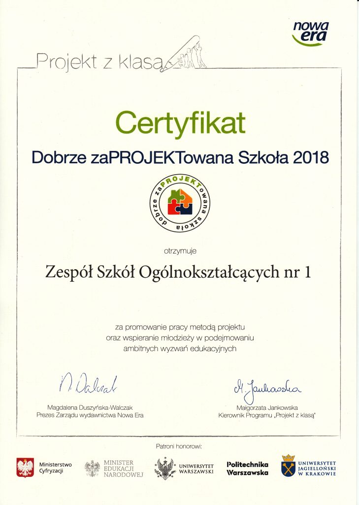 To prestiżowe wyróżnienie przyznało naszej szkole wydawnictwo Nowa Era – organizator konkursu – za przygotowanie oraz realizację w roku szkolnym 2017/18 projektu “Jedynka z pasją”.