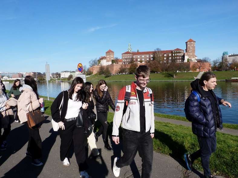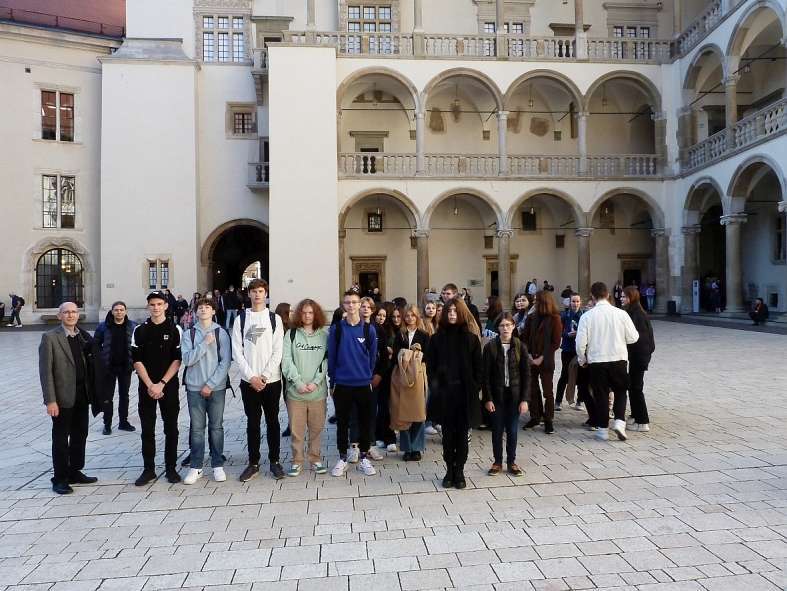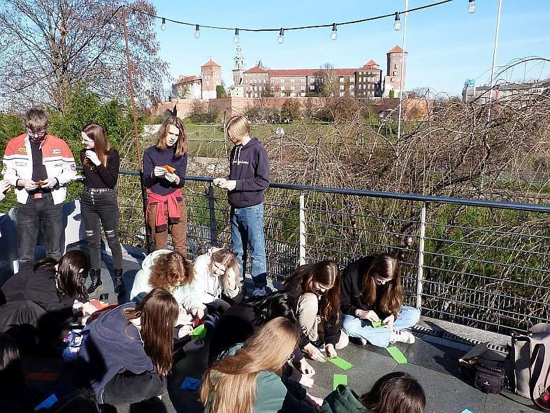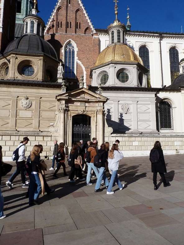 Po wizycie w Muzeum Sztuki Japońskiej przyszedł czas na spacer prezentujący najważniejsze zabytki Starego Miasta. Trasa rozpoczęła się od wzgórza wawelskiego. Tam uczniowie poznali renesansowe zabytki – Kaplicę Zygmuntowską oraz dziedziniec arkadowy zamku. Następnie uczestnicy wycieczki przeszli ulicą Kanoniczą, najstarszą ulica w Krakowie pełną okazałych zabytkowych portali, by kolejno ulicą Grodzką udać się pod kościoły śś. Piotra i Pawła oraz kościół franciszkanów, w którym obejrzeli witraże i polichromie Stanisława Wyspiańskiego. Kolejnym punktem na trasie była siedziba Collegium Maius. Wypełniony słońcem i wrażeniami artystycznymi spacer zakończył się na Rynku.