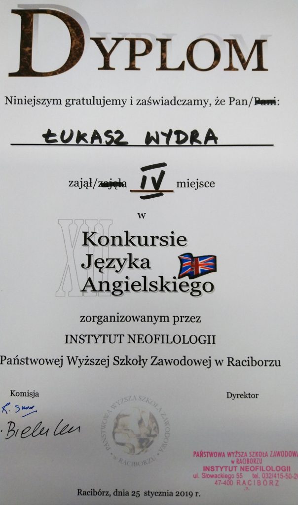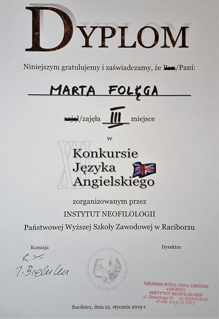 25 stycznia odbył się finał XII Konkursu Języka Angielskiego zorganizowanego przez PWSZ w Raciborzu. Głównymi nagrodami dla laureatów konkursu były indeksy na wybrane studia filologiczne na PWSZ w Raciborzu. Spośród 10 indeksów 2 otrzymali nasi uczniowie Marta Folęga i Łukasz Wydra. Gratulujemy!