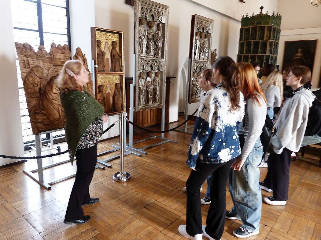 Druga część muzealnego spotkania była poświęcona sztuce gotyckiej. Na przykładach dzieł z kolekcji muzeum oraz konstrukcji prezbiterium zostały omówione najważniejsze kwestie związane z architekturą, rzeźbą i malarstwem tego stylu.