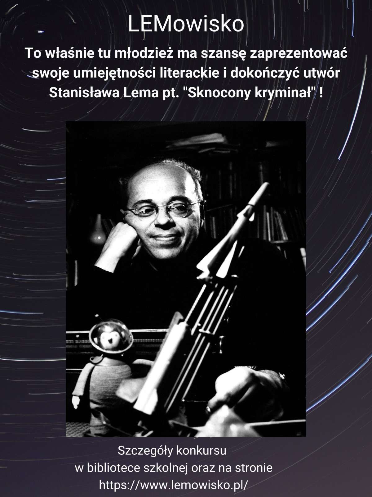 Ogólnopolski konkurs literacki “Sknocony kryminał” (edycja 2022) skierowany jest do młodzieży szkół średnich oraz techników wszystkich klas. Zadaniem uczestników jest przygotowanie pracy konkursowej w formie tekstu literackiego/wypracowania, będącego autorską (tj. samodzielną) wersją zakończenia tzw. “Sknoconego kryminału”, czyli utworu napisanego przez Stanisława Lema, który urywa się w pewnym momencie, gdyż autor uznał, że nie warto go kontynuować. Zakończenie musi się mieścić w ustalonych ramach objętościowych (do 3 stron formatu A4).