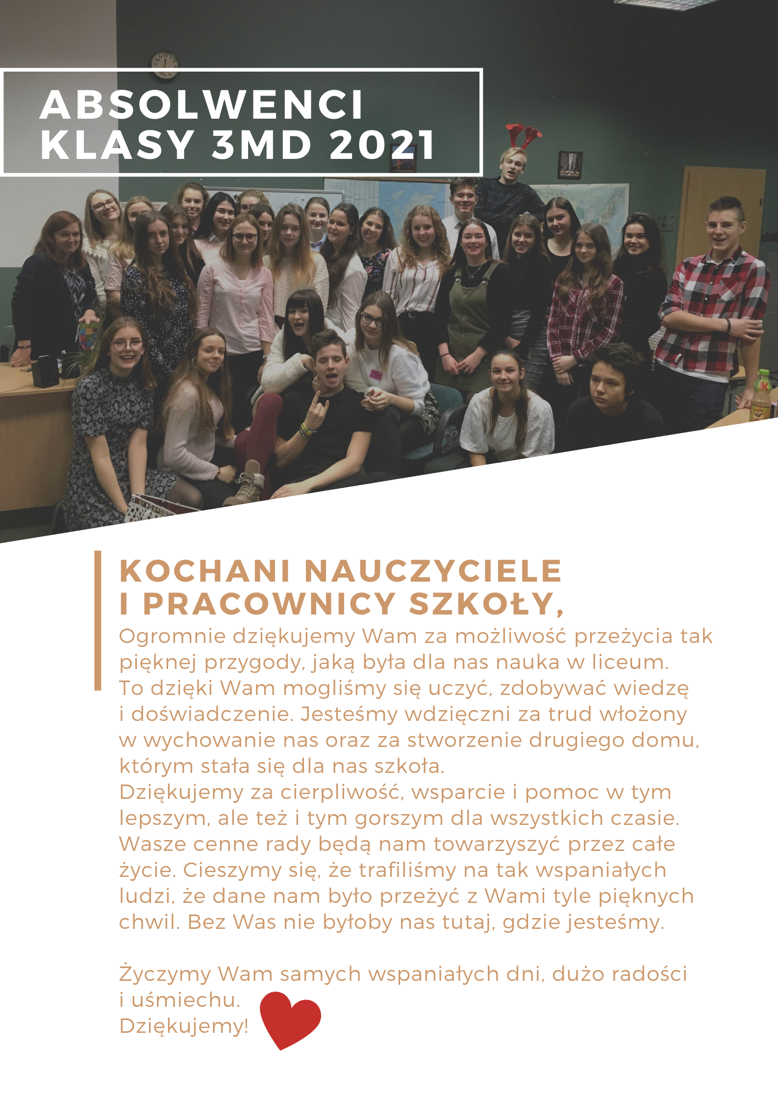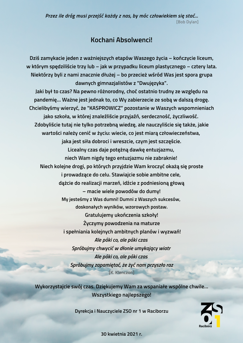 Piątek 30 kwietnia 2021 roku to data, która została wyznaczona na zakończenie zajęć w klasach programowo najwyższych. Zwykle w takim dniu gromadziliśmy się w auli lub w RCK w Raciborzu, by uroczyście pożegnać maturzystów, ale już drugi raz z rzędu ze względu na pandemię odebrano nam taką możliwość. Pozostało nam tylko wykorzystać te same kanały, za pomocą których realizujemy lekcje i spotkać się na Meet. Tak właśnie dziś wychowawcy pożegnali swoje klasy.