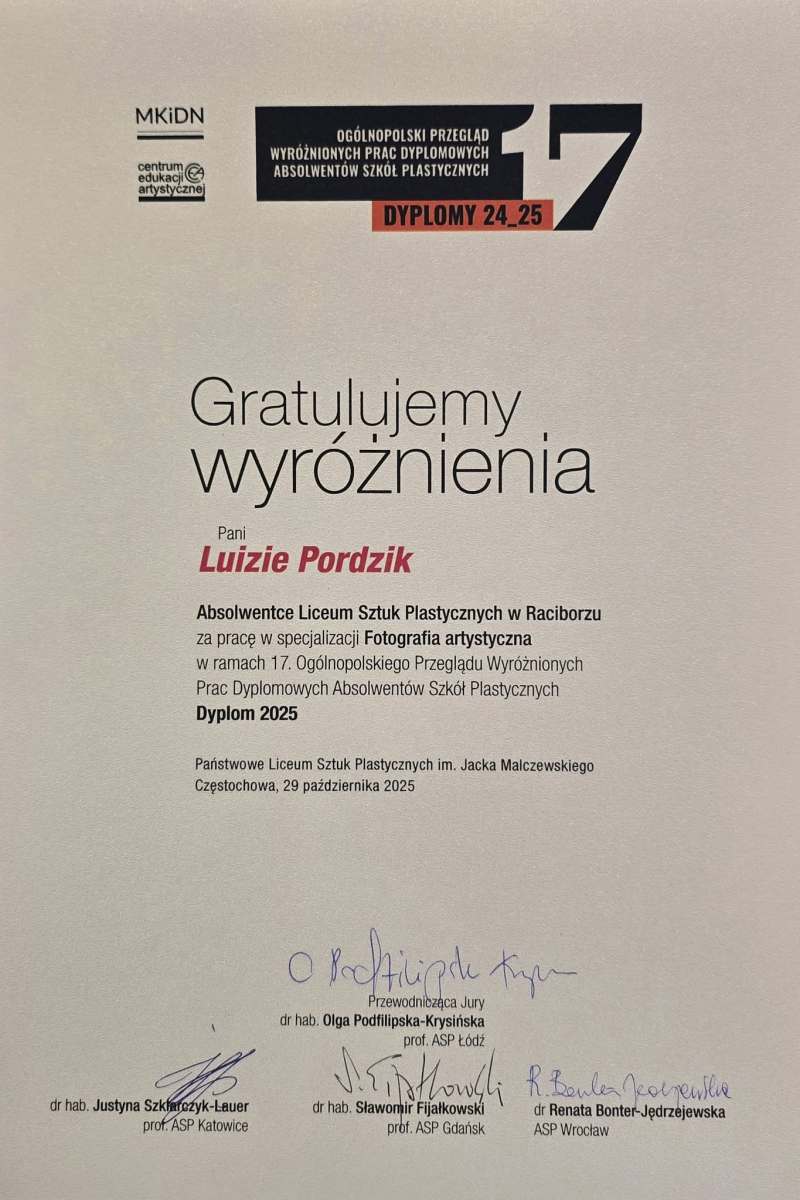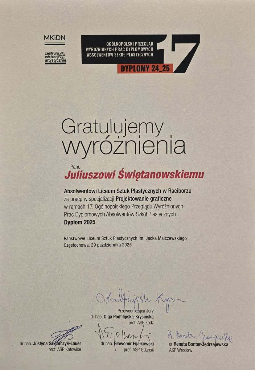 Z wielką radością możemy poinformować, że w 17. Ogólnopolskim Przeglądzie Wyróżnionych Prac Dyplomowych Absolwentów Szkół Plastycznych nasze Liceum Sztuk Plastycznych w Raciborzu otrzymało aż 2 wyróżnienia!