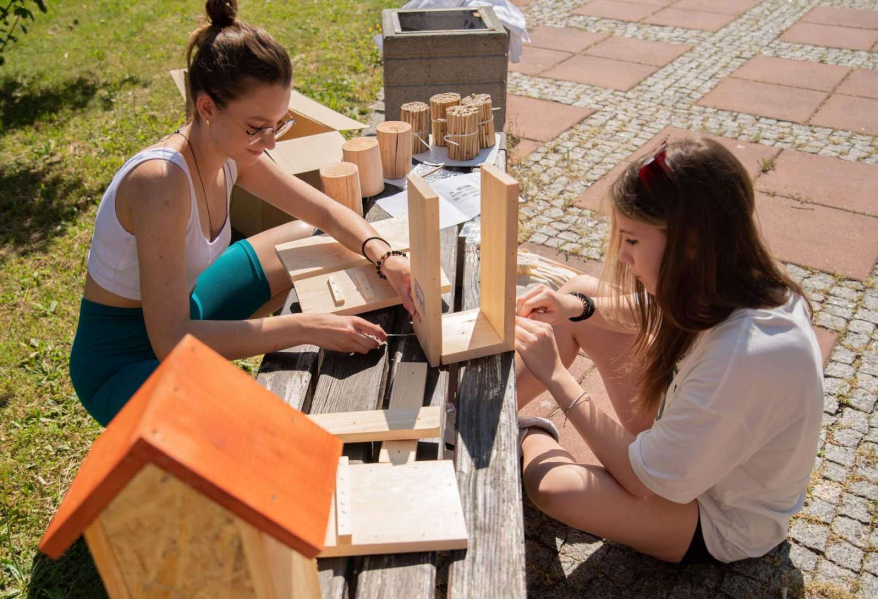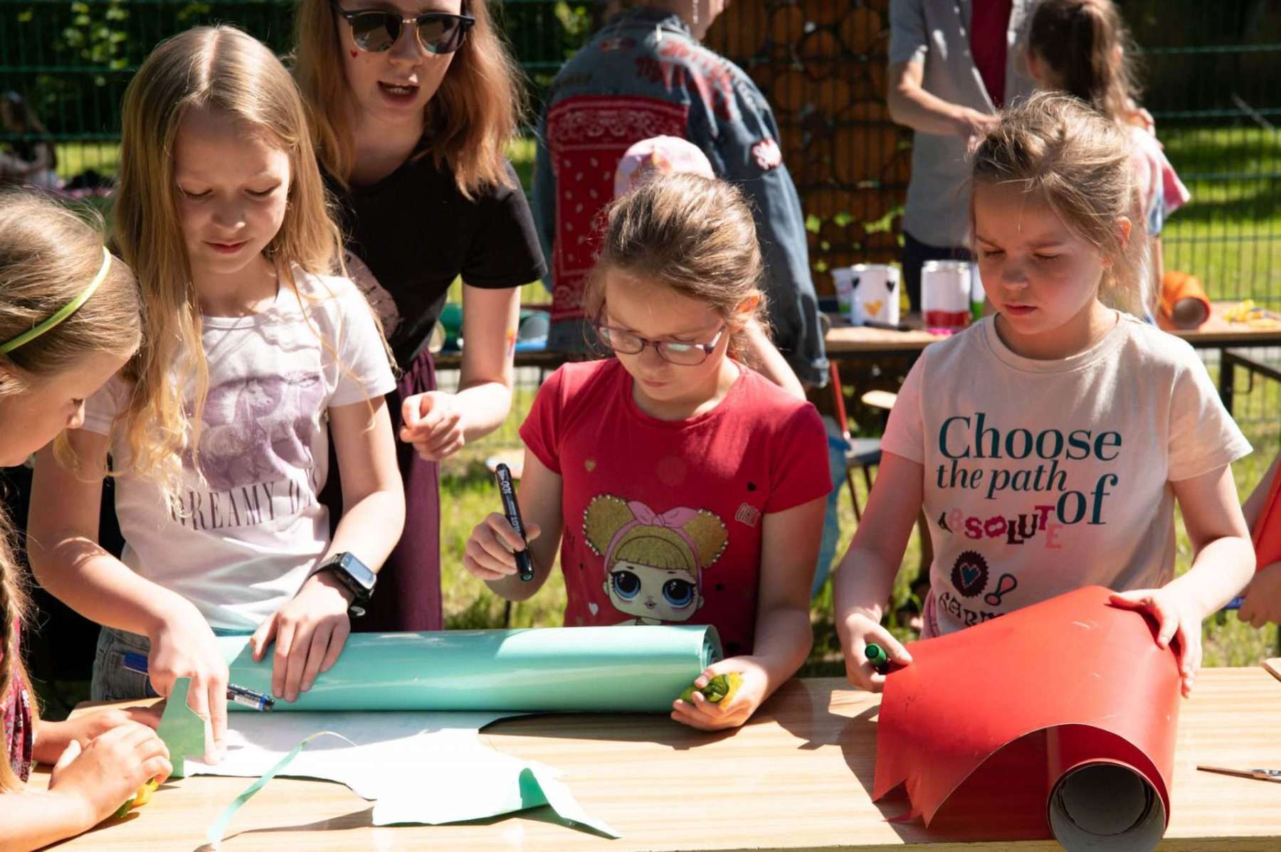 Imprezę rozpoczęła jak co roku integracyjna “belgijka”, w której każdy – duży czy mały, uczeń czy nauczyciel, znalazł dla siebie miejsce. Taniec szybko przełamał początkową nieśmiałość i stał się motywacją do dalszej zabawy, która do wczesnego popołudnia trwała przy ulicy Kasprowicza. Czas ten upłynął na wspólnych grach i zabawach, rozgrywkach sportowych i umysłowych oraz warsztatach plastycznych. Trzeba przyznać, że szczególnym powodzeniem na tegorocznym pikniku cieszyło sie strzelanie z łuków oraz możliwość przejścia po linie równoważnej. Obie zabawy zorganizowane przy wsparciu PCS-u odbywały się w zielonym zagajniku za salą gimnastyczną. Duże i niezwykle radosne zainteresowanie wśród najmłodszych uczniów z SP4 wzbudzały aktywności odbywające się w naszym szkolnym ogrodzie. Tam nauczyciele wraz z uczniami Liceum Sztuk Plastycznych przygotowali dla dzieciaków z sąsiedztwa warsztaty plastyczne, a licealna młodzież zachęcała wszystkich do muzycznej zabawy karaoke. Oczywiście Dzień Dziecka to też pierwszy dzień, gdy trawnik szkolnego ogrodu wypełnia się kolorowymi kocami i radosnym chilloutem. To takie nasze wzywanie wakacji…