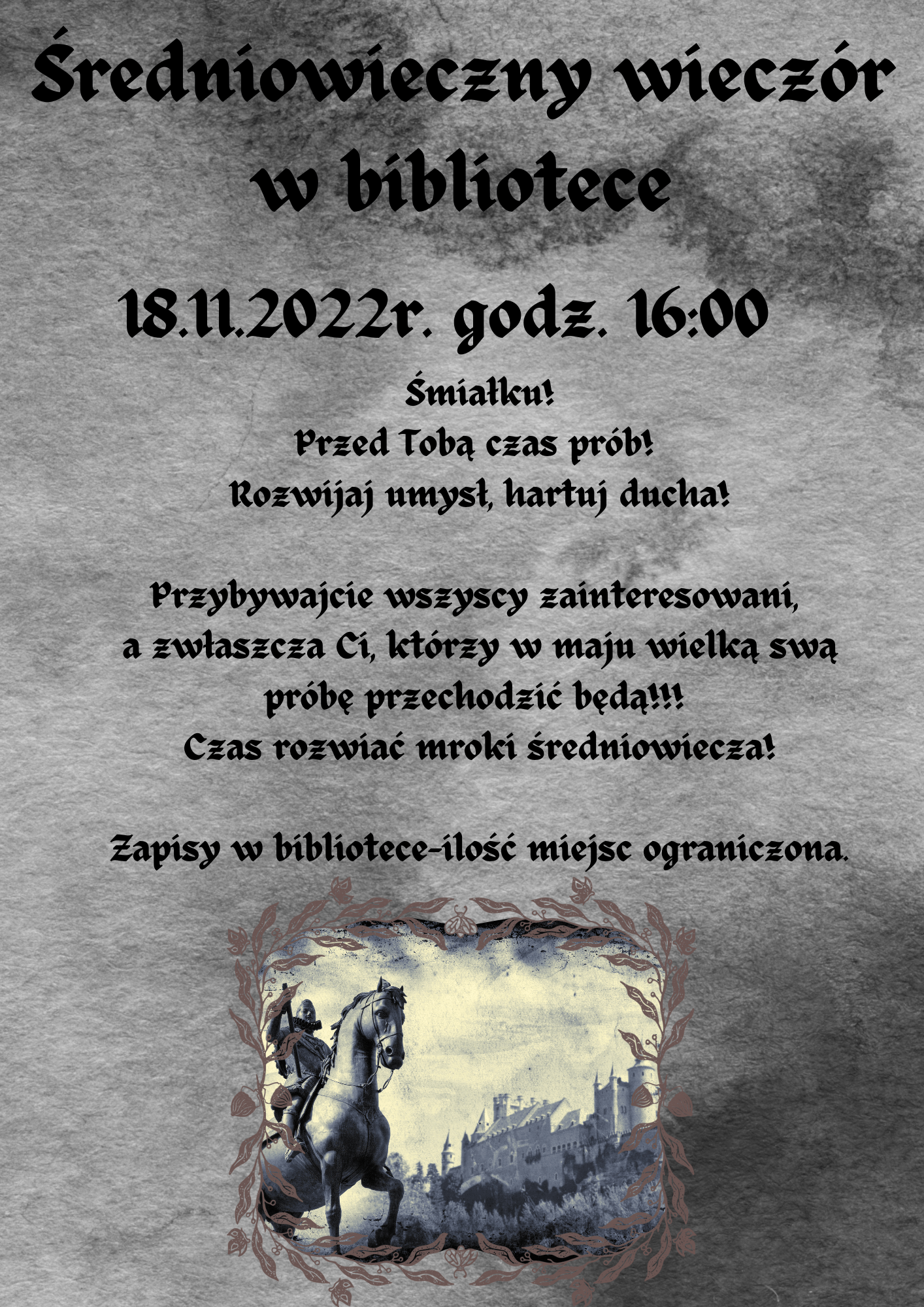 Biblioteka szkolna zaprasza wszystkich uczniów, a szczególnie maturzystów, na “Średniowieczny wieczór w bibliotece”. Czwartoklasiści będą mogli w ciekawy i aktywny sposób powtórzyć wiadomości, a młodsi wziąć udział w tajnej misji zwiadowców. Zapisy w bibliotece!!!