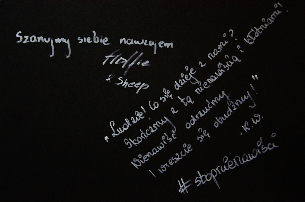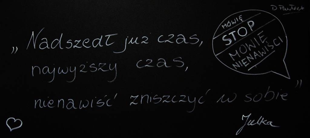 STOP NIENAWIŚCI! – takim hasłem 18 stycznia symbolicznie ogłosiliśmy deklarację całej społeczności szkolnej. Dla DOBRA i SZACUNKU wobec drugiego Człowieka. To wyraz gotowości i zarazem protest przeciwko temu, co nas niszczy. Na parterze szkoły umieściliśmy pusty plakat opatrzony hasłem STOP HEJT! Każdy mógł na nim zapisać swoją myśl. Chcieliśmy w ten sposób przypomnieć, jak ważny dla nas jest wzajemny szacunek. Uczyńmy ten świat lepszym, zaczynając od siebie.