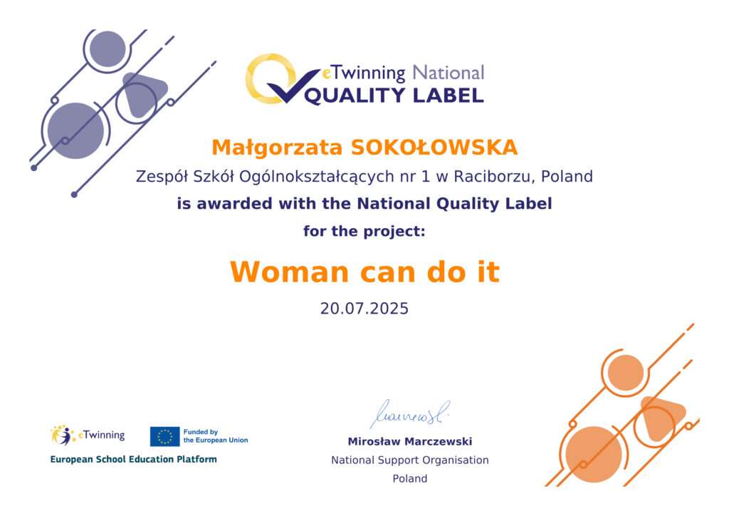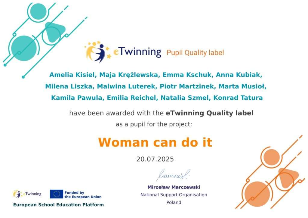 Miło nam poinformować, że nasza szkoła otrzymała Krajową Odznakę Jakości (Quality Label) za realizację w latach 2023-2025 międzynarodowego projektu „Woman can do it” w ramach synergii programów Erasmus+ i eTwinning.