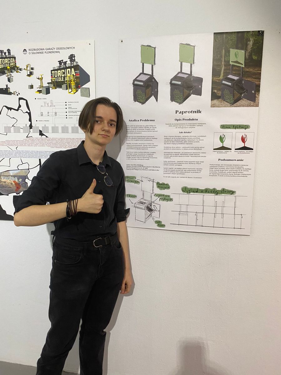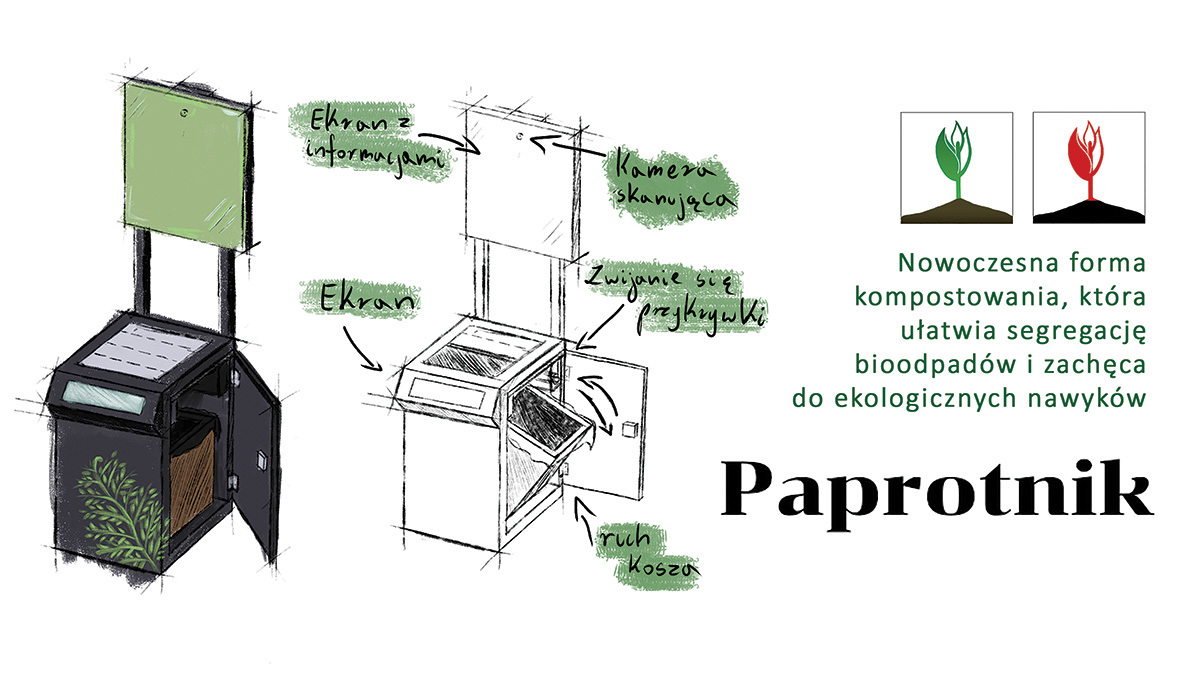 Praca pt. “Paprotnik” dotyczyła problemu braku czytelnych informacji na temat możliwości segregacji odpadów. W pracy wykorzystane zostało estetyczne i ergonomiczne rozwiązanie wizualne, które nie tylko spełnia zasady ekoprojektowania, ale też doskonale wpisuje się w przestrzeń miejską i naturalne otoczenie.