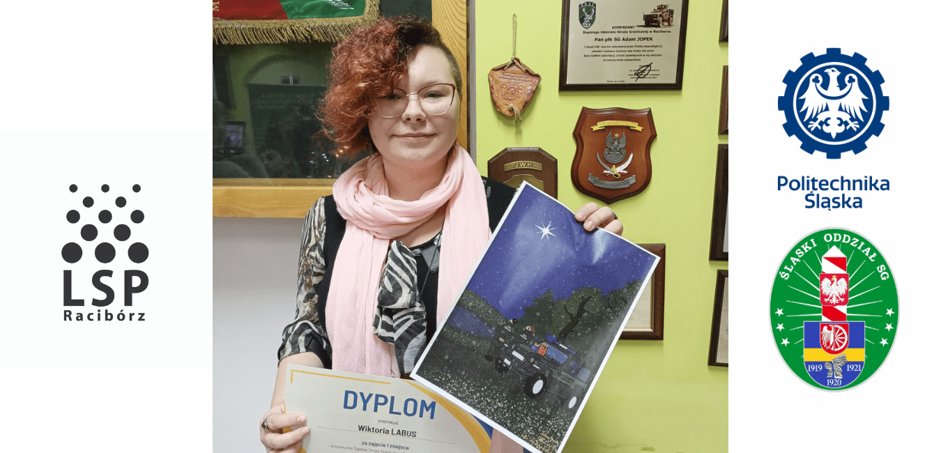 Miło nam poinformować, że uczennica klasy 2 LSP, Wiktoria Labus, zdobyła pierwsze miejsce w konkursie plastycznym na kartkę bożonarodzeniową. Organizatorami konkursu byli: Śląski Oddział Straży Granicznej w Raciborzu oraz Politechnika Śląska w Gliwicach. Uroczyste wręczenie nagród obyło się w środę 7 grudnia 2022r.