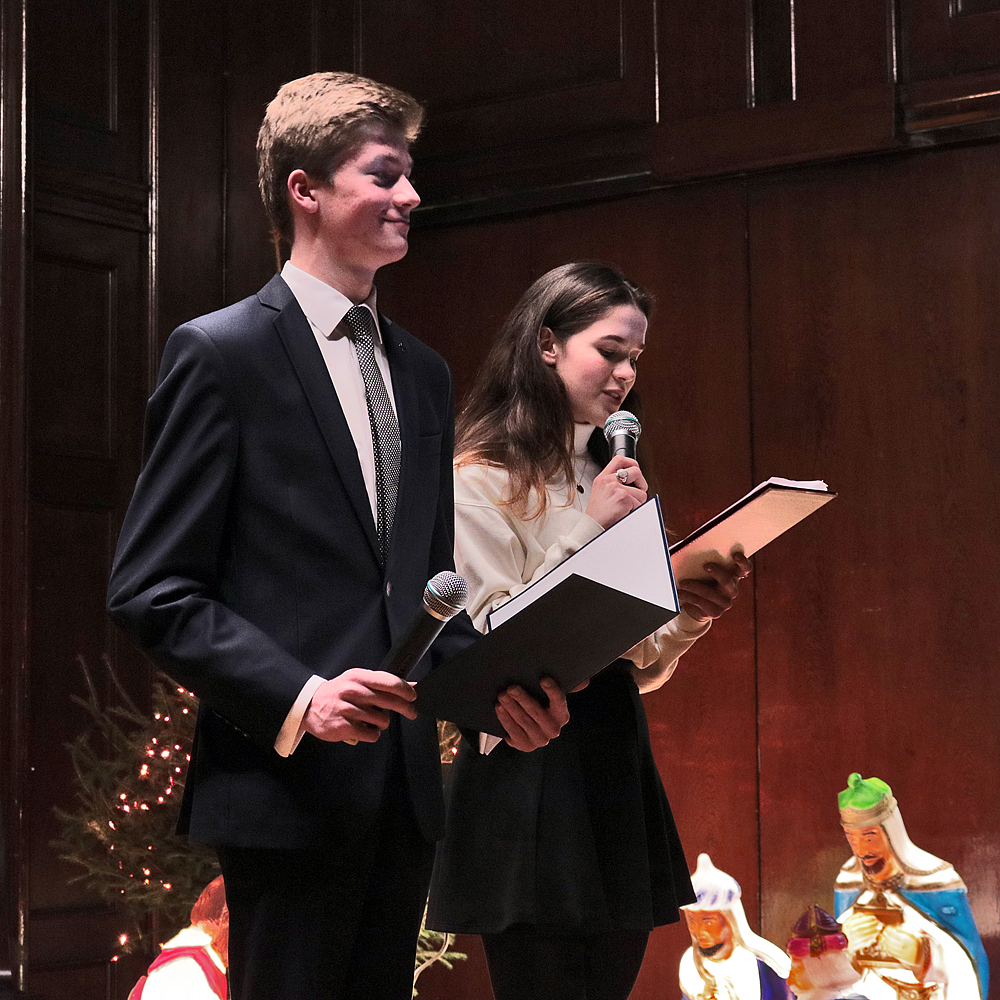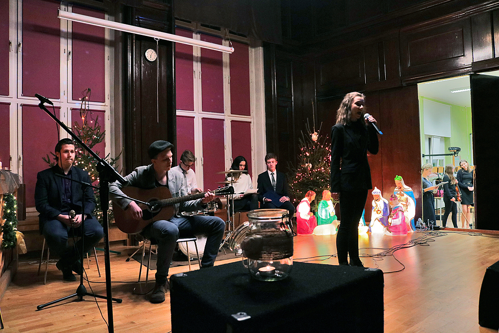 Koncert poprowadzili Julia Jacek i Łukasz Czogalik. Usłyszeliśmy kolędy, pastorałki i świąteczne piosenki w różnych językach, jakich uczą się uczniowie naszej szkoły. Wokalistom: Miriam Reszce, Natalii Pisarczyk, Oliwii Kostce, Natalii Bubon, Zuzannie Wieczosek, Dominice Krumpietz, Tymoteuszowi Pawłowskiemu i Dariuszowi Nowakowi akompaniowali instrumentaliści. Anna Groeger zagrała na pianinie, Dominik Depta i Tomasz Furgoł na gitarach, Wiktor Kubala na perkusji, Julia Mokry na skrzypcach a Michał Gaj na melodyce.