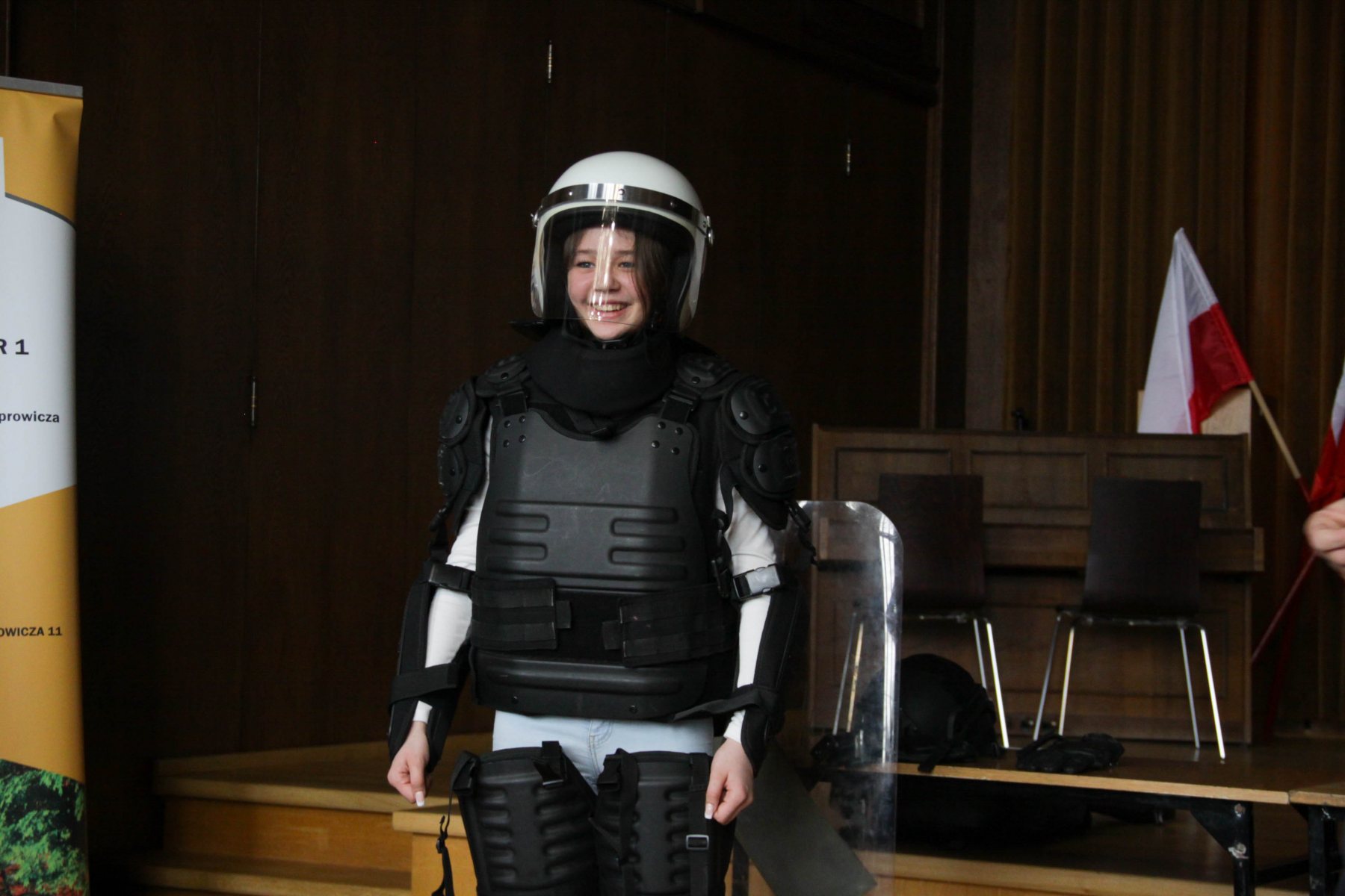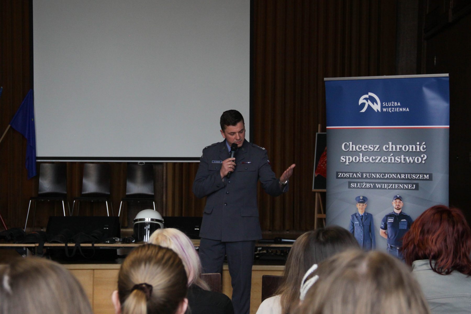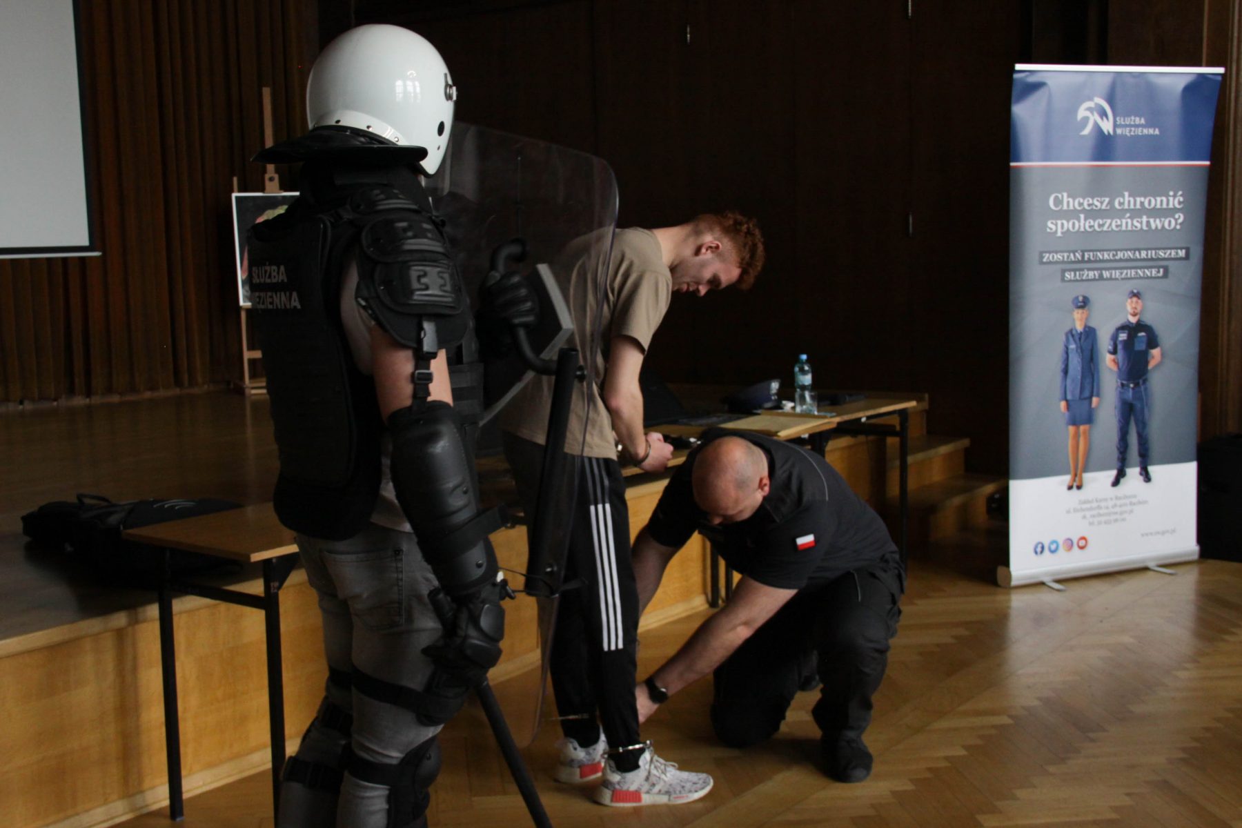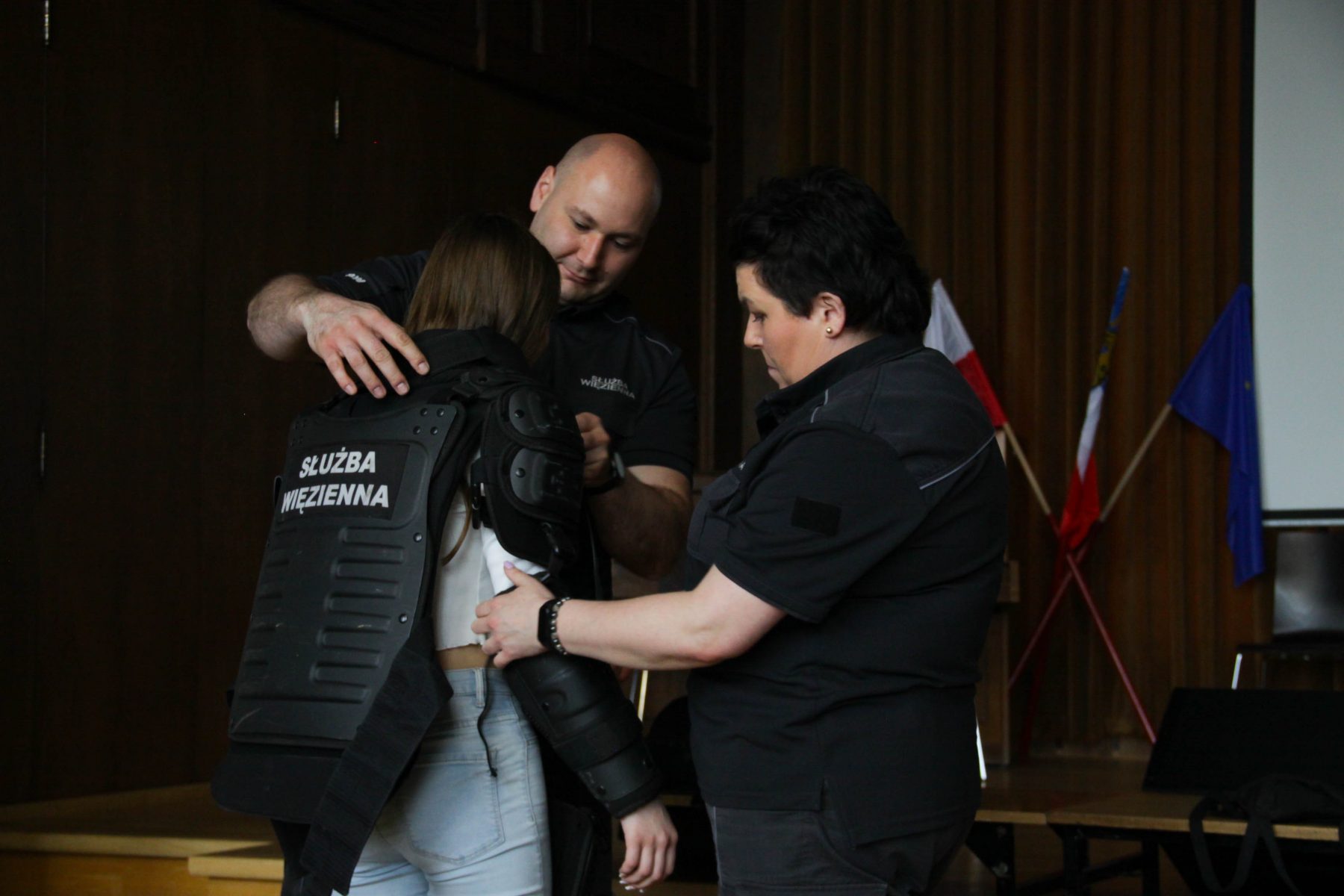 Dzisiaj 17 kwietnia 2023 r. gościliśmy pana Macieja Koniora dyrektora Okręgowej Służby Więziennej w Katowicach. Pan Konior bardzo ciekawie opowiadał o swojej pracy, zaprezentował różne akcesoria potrzebne w służbach mundurowych. Uczniowie mieli okazję założyć ochraniacze, kajdanki, kaski. Była to wciągająca zabawa, ale i nauka.