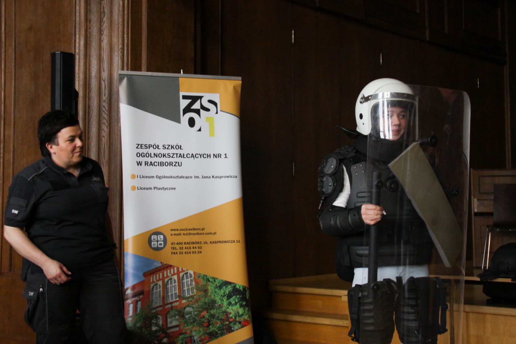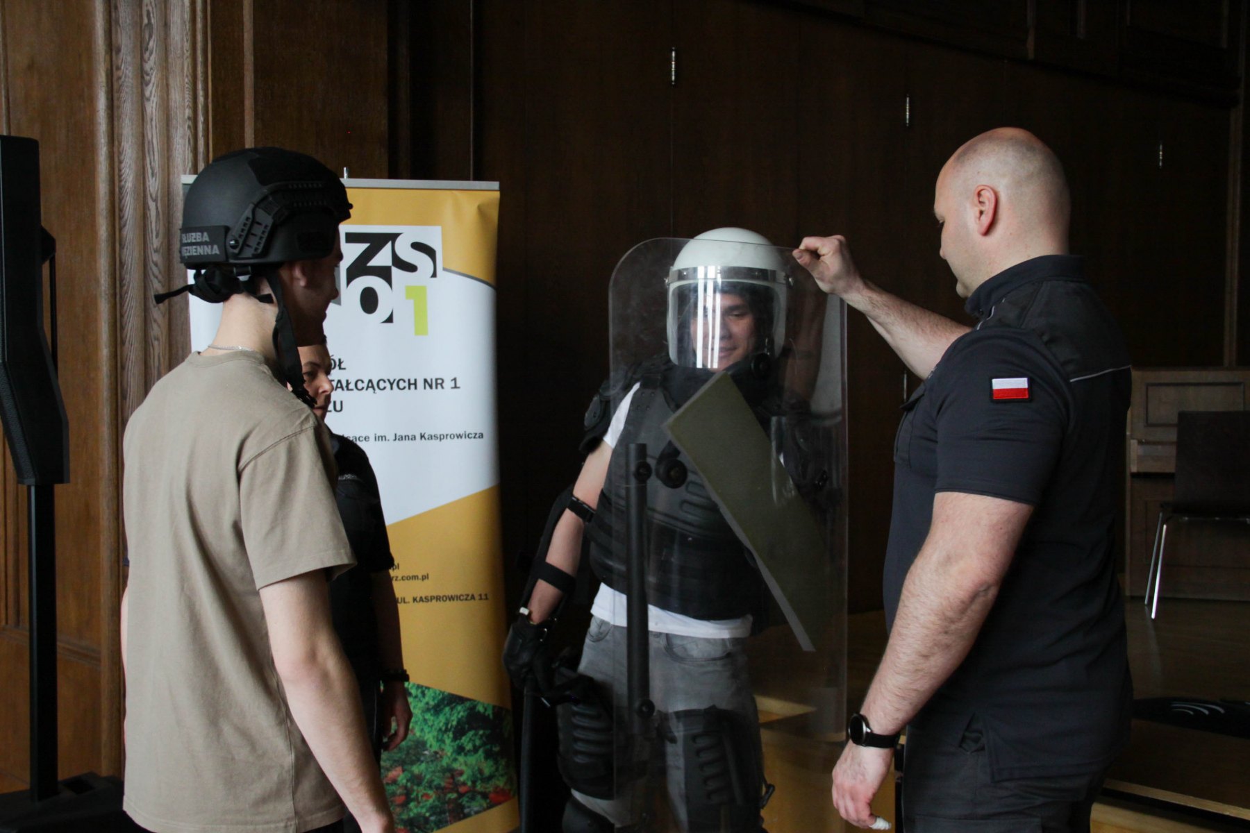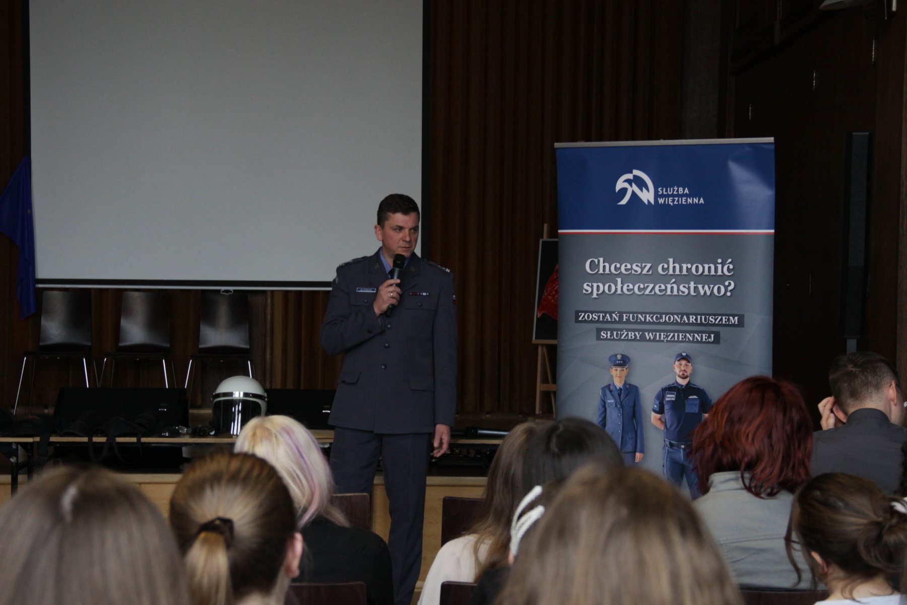 Dzisiaj 17 kwietnia 2023 r. gościliśmy pana Macieja Koniora dyrektora Okręgowej Służby Więziennej w Katowicach. Pan Konior bardzo ciekawie opowiadał o swojej pracy, zaprezentował różne akcesoria potrzebne w służbach mundurowych. Uczniowie mieli okazję założyć ochraniacze, kajdanki, kaski. Była to wciągająca zabawa, ale i nauka.
