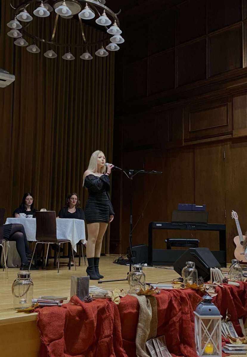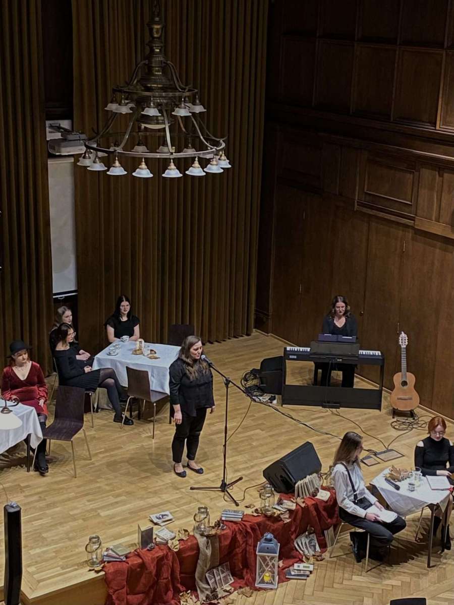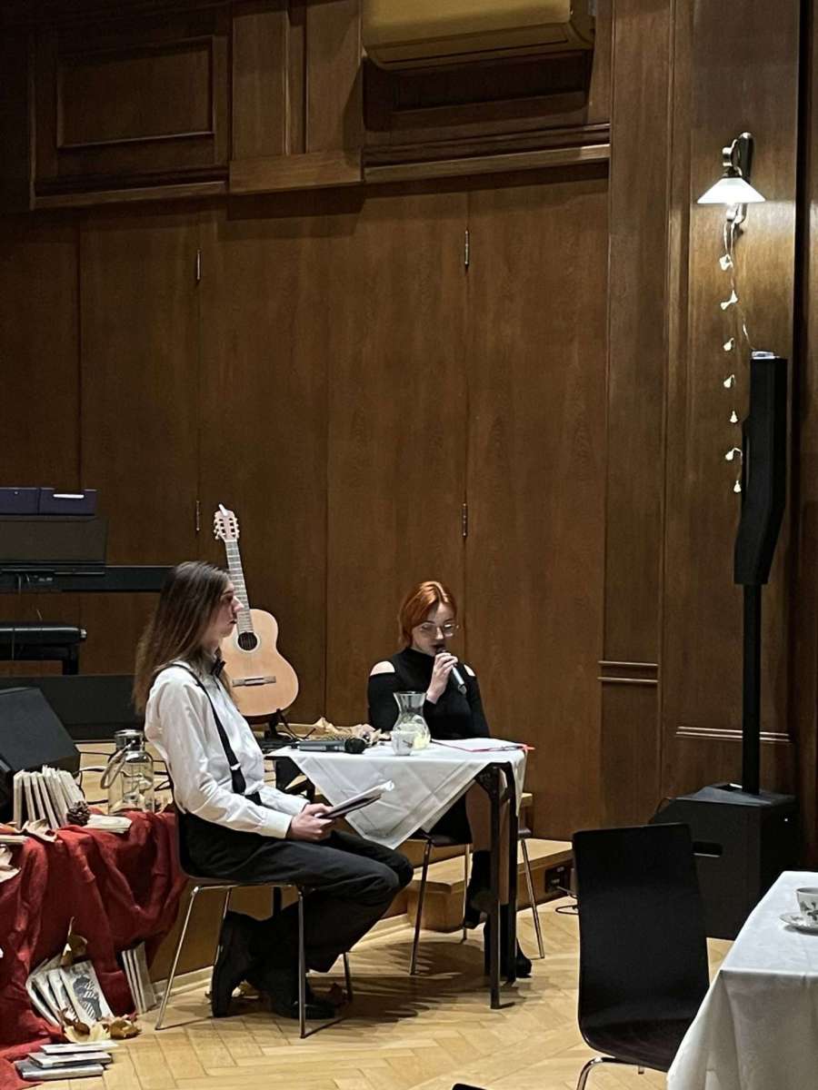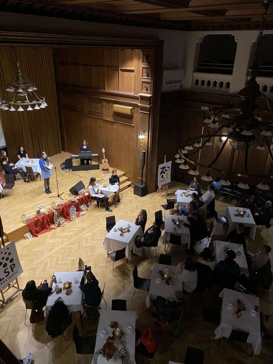 29 listopada 2023 r., już w zimowej scenerii, a jednak ciągle jeszcze jesienią, odbyła się kolejna odsłona wieczorku poetyckiego “U Kasprowicza“. Na naszej scenie pojawiły się prawdziwe talenty, których duszę, serca i myśli zniewoliła boska Kaliope. Usłyszeliśmy teksty napisane przez uczniów i zaprezentowane przez ich autorów: Karolinę Szymiczek – 5LSP, Vanessę Kapłanek – 3JM oraz Michała Florka – 2HB, a także teksty poetów znanych i lubianych przez tłumy: Wisławy Szymborskiej, Tadeusza Różewicza, Haliny Poświatowskiej, Jerzego Jurandota zaprezentowane przez: Michalinę Danowską – 4M, Martę Musioł – 2LSP, Milenę Fuks – 2LSP i Felicję Pytlik – 4H. Wybrzmiały również przepiękne aranżacje tekstów Agnieszki Osieckiej, Jonasza Kofty, Jacka Kaczmarskiego, Krzysztofa Kamila Baczyńskiego i Juliana Tuwima w wykonaniu Emilie Grüner – 2J, Marty Plury – 3B, Wiktorii Szebel – 4H, Amelii Huczek – 4B i naszej uzdolnionej muzycznie polonistki – pani Magdaleny Myśliwy. Do wszystkich utworów muzycznych aranżacje przygotowała Martyna Nowak uczennica klasy 4B.