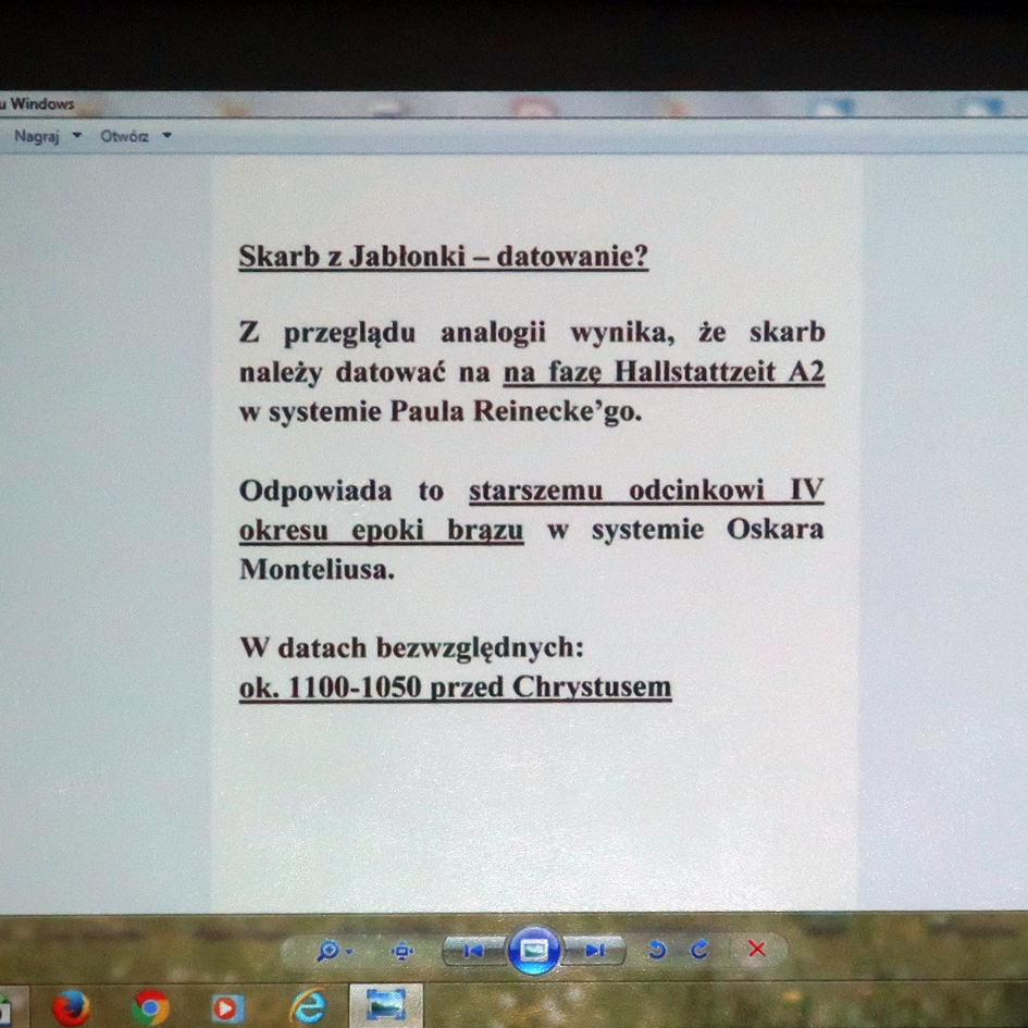 Jak poinformowała nas Pani archeolog Izabela Szter z głubczyckiego muzeum: Fotografowane zabytki to tzw. „skarb z Jabłonki”, który został odkryty na obrzeżach wsi w maju 2015 roku. Przedmioty te były prawdopodobnie złożone w jamie (ukryte?). Tego dokładnie nie wiem, gdyż zabytki znaleziono na powierzchni ziemi, poza ich pierwotnym kontekstem zdeponowania. Być może zostały wyorane na powierzchnię, na co wskazywałby deformacje dwóch naramienników/nagolenników. Zabytki te mają ponad 3 tys. lat. Dokładnie datować należy je na 1 połowę XI w. przed narodzeniem Chrystusa i wiązać z ludnością tzw. kultury łużyckiej, która w tym czasie zasiedlała tereny Śląska.