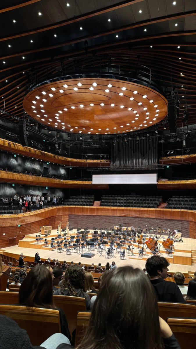 Jazda pociągiem okazała się dla nas niełatwym doświadczeniem z uwagi na piątkowo przepełnione wagony, ale pełni nadziei na przeżycia estetyczne dotarliśmy do miejsca docelowego. Kiedy weszliśmy do niezwykłej sali koncertowej, szybko zapomnieliśmy o trudach podróży, bo naszym oczom ukazał się widok, który chyba wszystkich zaskoczył. Sala jest perełką architektoniczną o niezwykłej akustyce i przepięknych, nieoczywistych kształtach. Pozytywne doświadczenia od tej chwili tylko rosły.
